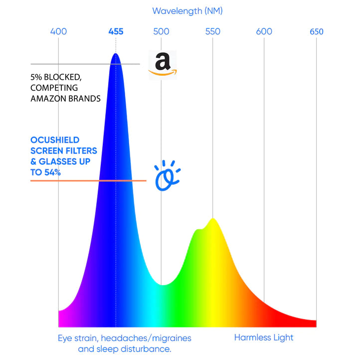 Med økende skjermtid skaper nye merker og kjente navn skjermbeskyttere eller briller som filtrerer blått lys, men det er mye varm luft... De fleste produktene filtrerer ubetydelige mengder høy-energi blått lys, under 10 % i gjennomsnitt. Ocushield-teknologi sikrer at opptil 99 % av UV/blått lys 300-400nm og 54 % av skadelig blått lys blokkeres mellom 400-470nm.